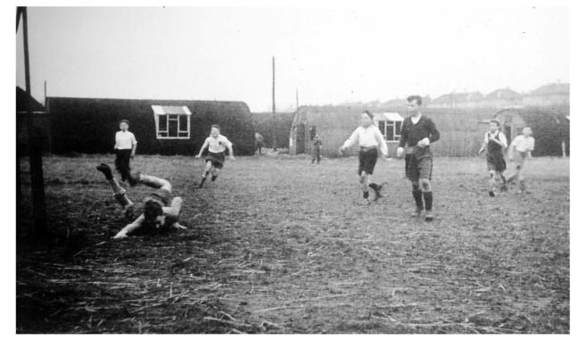 Football on the Depot Field, showing the Nissen Huts after they had been converted for civilian letting.