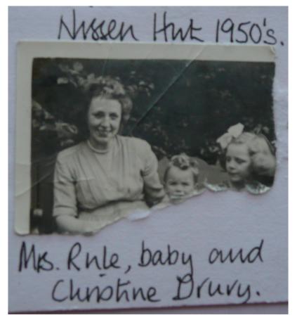 A Mr Mrs Rule and their two children, Christine and younger child, name not certain, could have been Janet, lived in the last hut (next to Mr. Mrs. Drake), and at the end of their garden, lay two air raid shelters, with a brick entrance, disguised as a grassy mound. Once inside, there was sufficient room for four adults or more. Unfortunately though, there was no roof, at the time, which must have deteriorated or been removed. On the opposite end of this row of huts lived a family of German folk, whilst right in the centre of the site, a hut was occupied by a Mrs. W, and her children.