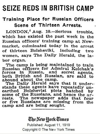 The other officer, Lieutenant Eugene Petrov, is simply recorded as 'died'.It was a difficult time for these men, who were very much aware of their homeland being torn apart by civil war and their families caught up in the strife. It seems that the officers were treated as honoured guests by the British establishment who saw them as our allies in the British oposition to the Bolsheviks. On the other hand, however, all was not brotherly comradeship in the Newmarket Camp as the report (see above) from the New York Times confirms. Newmarket had unwittingly become the remote battleground for some of the bitter recriminations being fought out in Russia.