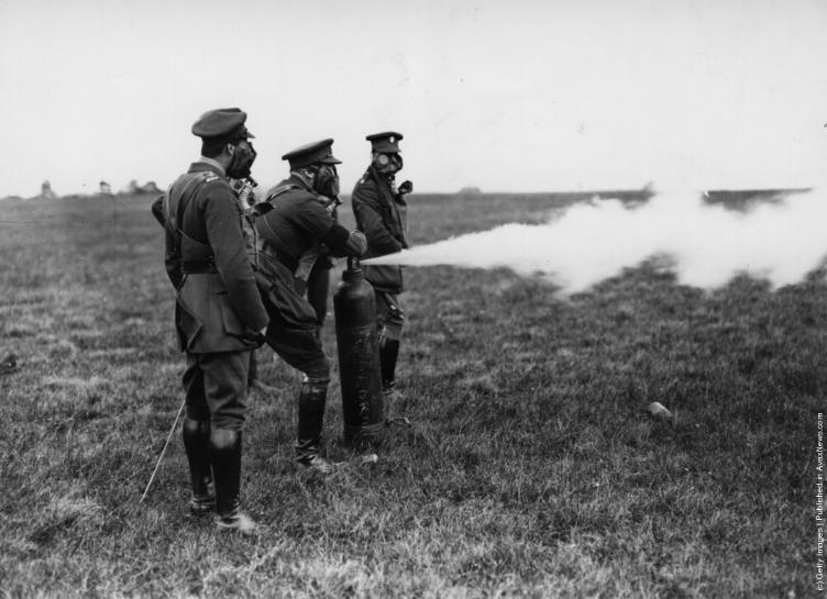 Russian Officers releasing tear gas during training manoeuvres on Newmarket Heath, 1919