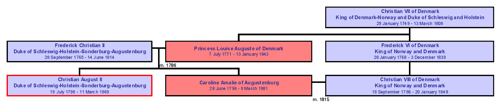 To give him his full title, the Duke was Christian August II, Duke of Schleswig-Holstein-Sonderburg-Augustenburg, and was a close successor to the Danish throne. As shown in the Danish royal family tree below, the Duke’s sister was the second wife of King Christian VIII and his mother was the sister of King Frederick VI.