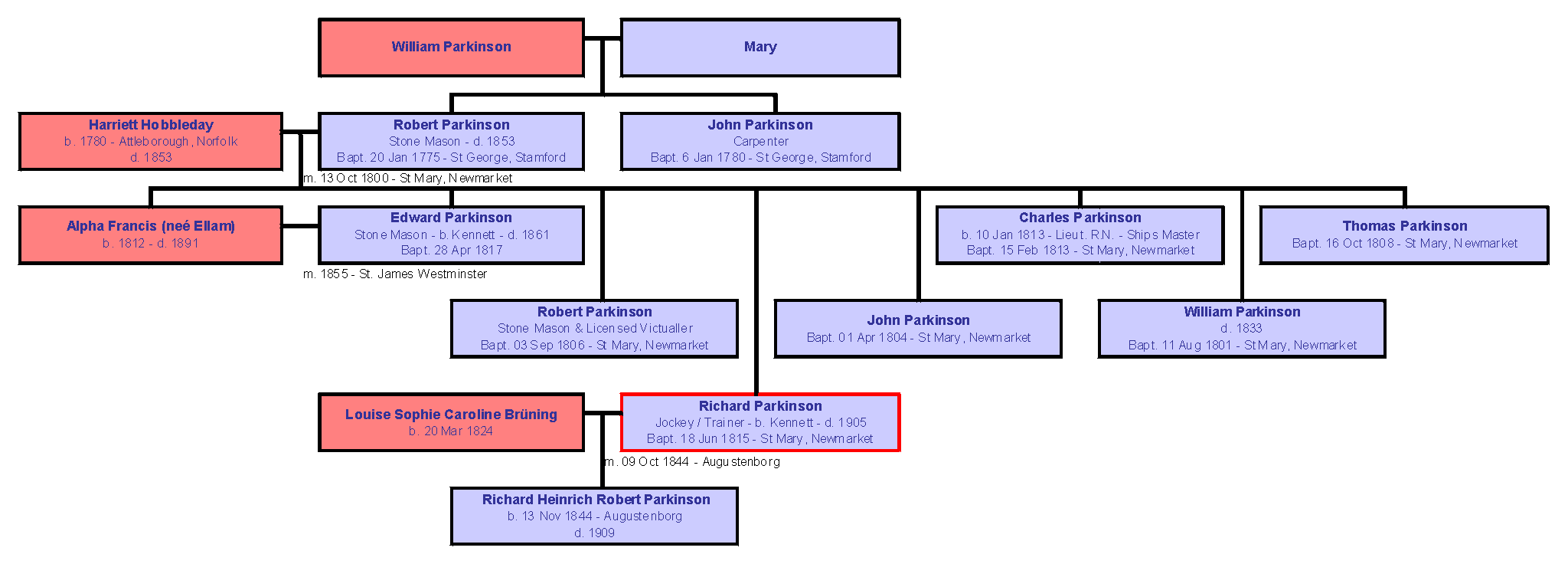 As shown in the family tree above and his birth record below, Richard's parents were Robert Parkinson and Harriet (neé Hobbleday), and he was baptised at St Mary's in Newmarket on 18th June 1815:-