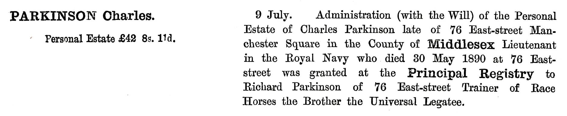 He died on 30th May 1890 and as is shown on his probate he was living at No.76 East Street, Manchester Square, Marylebone