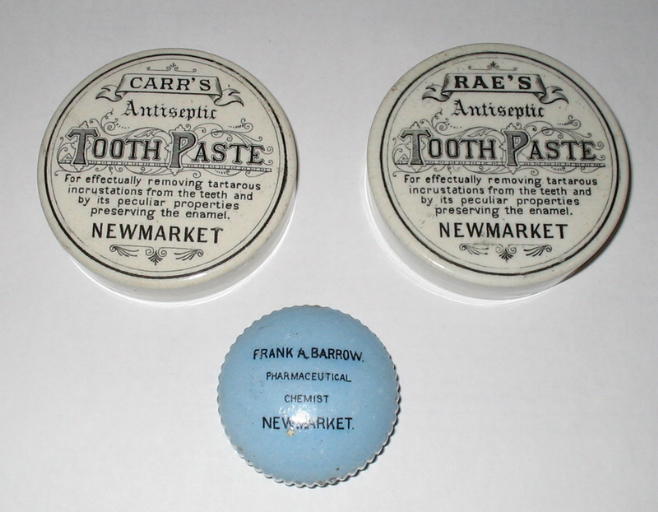 As well as often being minature works of art, Pot Lids can give an interesting insight into local history. Graham Evans published a book in 2008 giving pictures and details of 215 East Anglian pot lids, several of them advertising Newmarket chemists. We are indebted to him for the images below. (See also Corrrespondence December 2006)