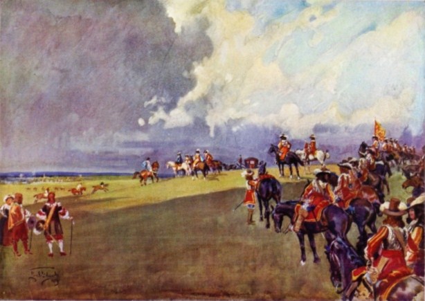 This painting entitled 'A sovereign's escort' gives an impression of the royal presence in Newmarket during the reign of Charles II,